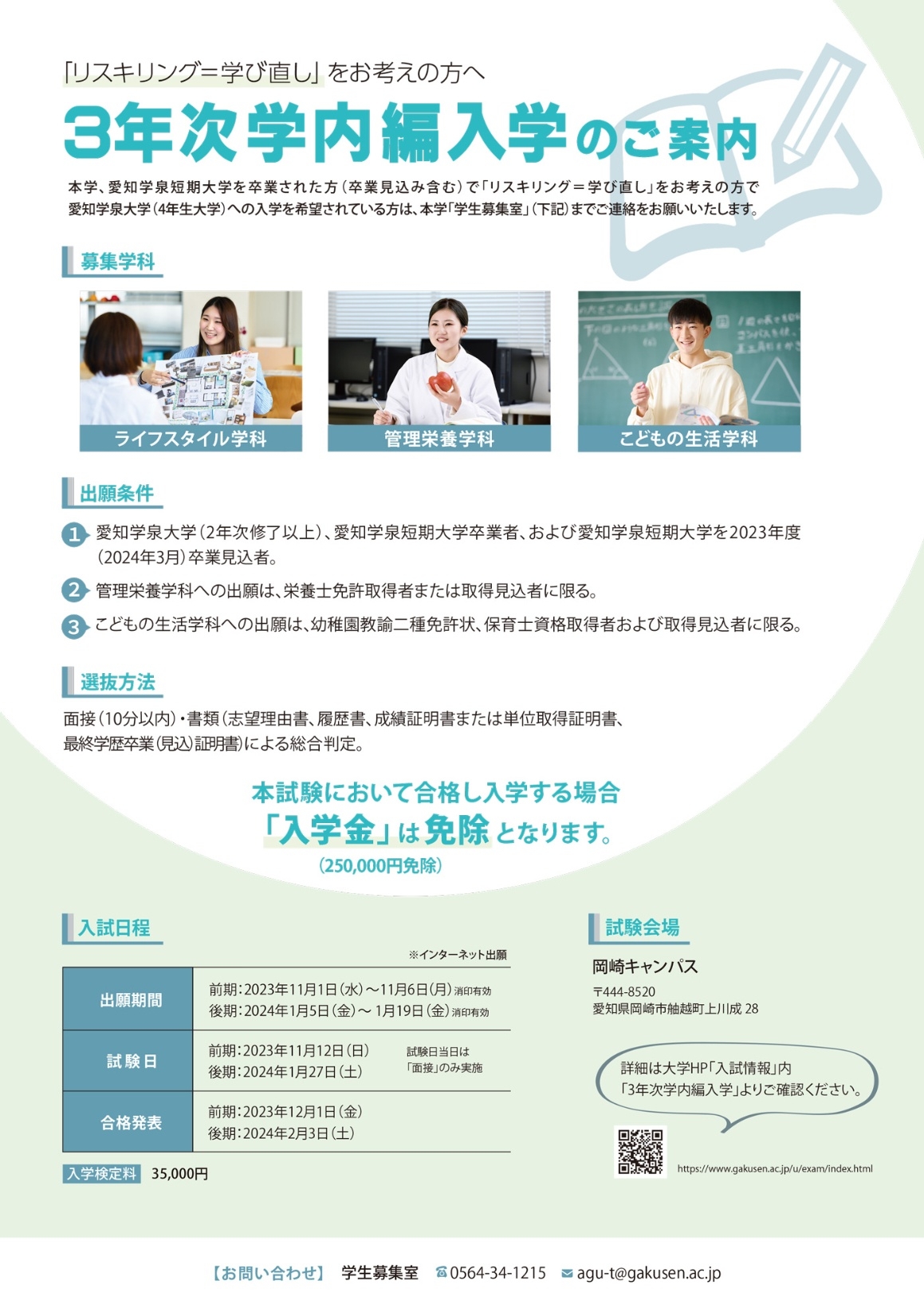 ご不明な点がありましたら、愛知学泉短期大学学生募集室までおたずねください。 ℡0564-34-1215